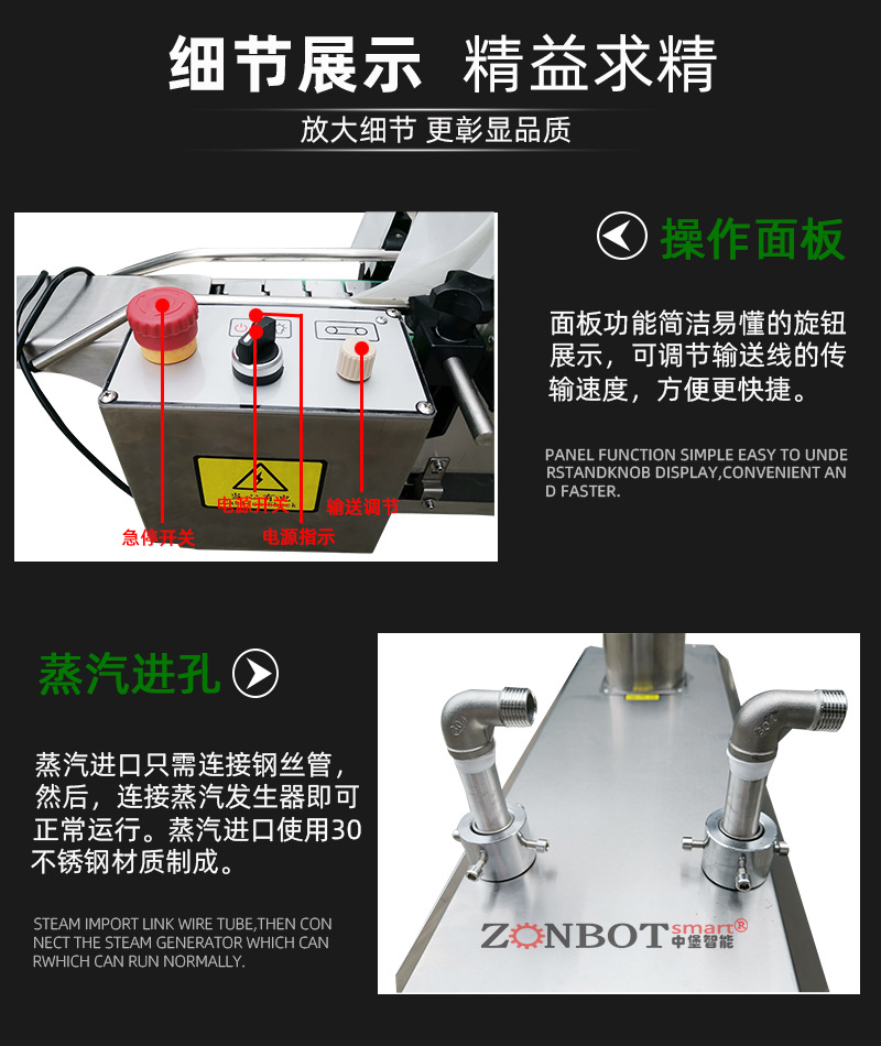 • 有輸送帶或者傳送滾軸,用于將包裝好的產(chǎn)品平穩(wěn)地輸送通過(guò)蒸汽通道。輸送速度可以根據(jù)產(chǎn)品的大小和包裝要求進(jìn)行調(diào)整。