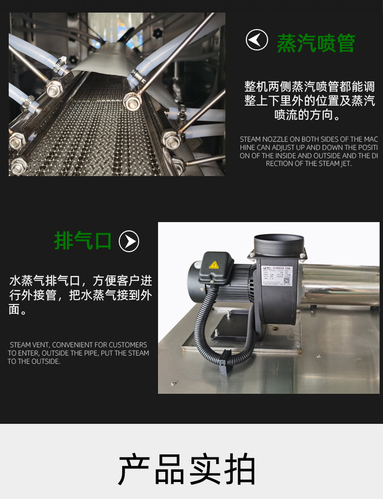 • 蒸汽收縮能夠使包裝膜緊密貼合產品,相比其他熱收縮方式(如熱風收縮),蒸汽的熱傳遞更加均勻,不會出現局部過熱導致包裝膜變形或破裂的情況,從而獲得更加美觀、平整的包裝外觀。