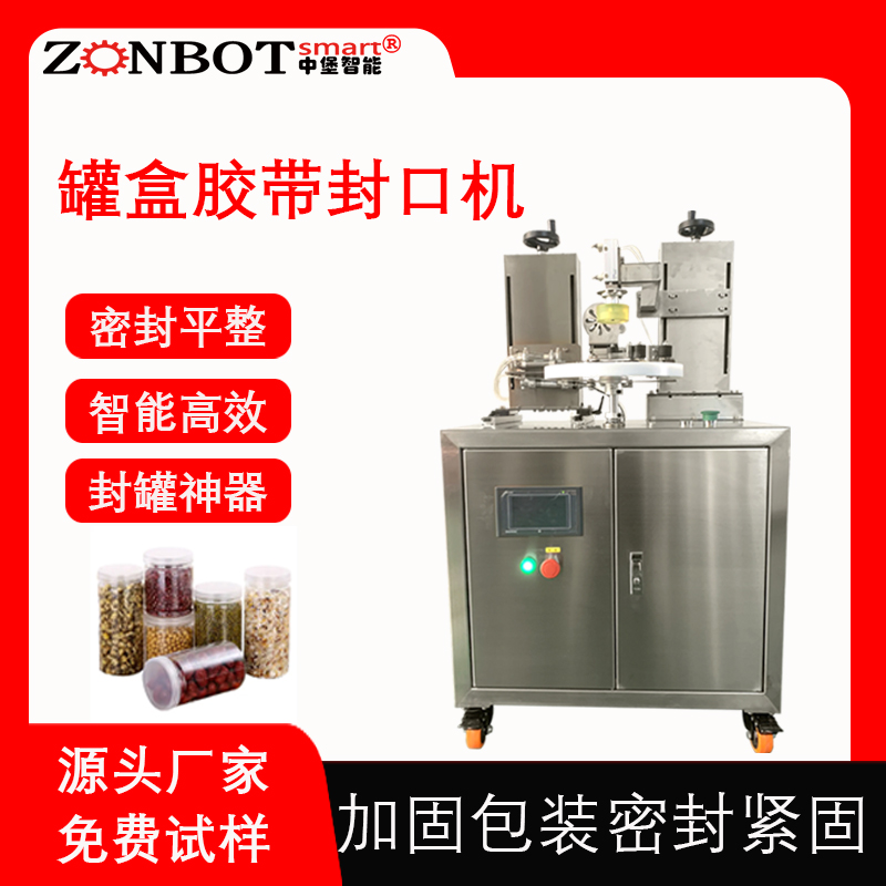 • 定位與準(zhǔn)備:當(dāng)罐盒被輸送到封口區(qū)域時,定位系統(tǒng)開始工作。通過光電傳感器或機(jī)械定位裝置,確保罐盒精準(zhǔn)地停留在封口位置。同時,膠帶供給系統(tǒng)啟動,將膠帶從膠帶卷上引出,經(jīng)過張力控制和引導(dǎo)部件,使膠帶處于準(zhǔn)備貼合的狀態(tài)。