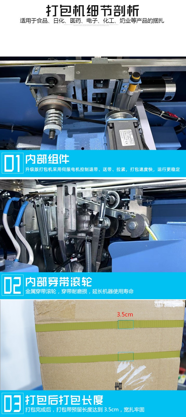 結構組成 伺服電機:作為核心部件,相比傳統電機,它能實現更高的控制精度和響應速度,可在捆扎時精準調整捆扎帶張力,保障捆扎的緊密與均勻。 控制系統:負責智能化管理整個捆扎流程。通過傳感器與程序控制,實時監測并調整捆扎速度、張力等參數,用戶還能依不同產品需求設定相應捆扎參數,滿足多樣化包裝需求。 捆扎裝置:一般采用熱合或熱熔方式固定捆扎帶。熱合是通過加熱使捆扎帶兩端熔合,形成牢固的捆扎效果,提高捆扎強度,防止運輸過程中松脫。 輸送系統:負責將待捆扎產品送入捆扎機,常與輸送帶或自動化生產線等其他生產設備聯動,形