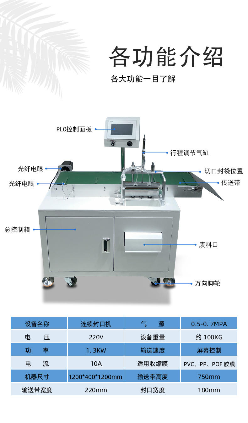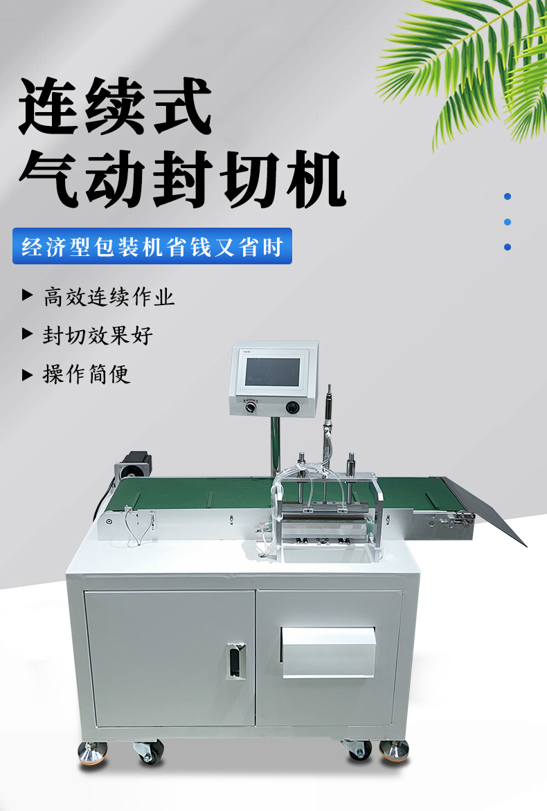 連續(xù)式氣動封切機(jī)是一種常用于包裝行業(yè)的設(shè)備,它能夠?qū)Ξa(chǎn)品進(jìn)行連續(xù)的封切操作,以下是對其的詳細(xì)介紹: 工作原理 連續(xù)式氣動封切機(jī)的工作原理是通過氣動系統(tǒng)驅(qū)動封切刀,實現(xiàn)對包裝材料的封口和切斷。具體來說,它通過氣缸的伸縮運動帶動封切刀上下移動,完成封切動作。當(dāng)產(chǎn)品輸送到封切位置時,氣動系統(tǒng)會控制封切刀下降,將包裝材料封口并切斷,然后封切刀上升,等待下一次封切信號。 結(jié)構(gòu)組成 封切機(jī)構(gòu):主要由封切刀、氣缸、刀架等組成,是實現(xiàn)封切功能的核心部件。封切刀通常采用合金材質(zhì),具有良好的耐磨性和耐熱性。 輸送機(jī)構(gòu):由輸送